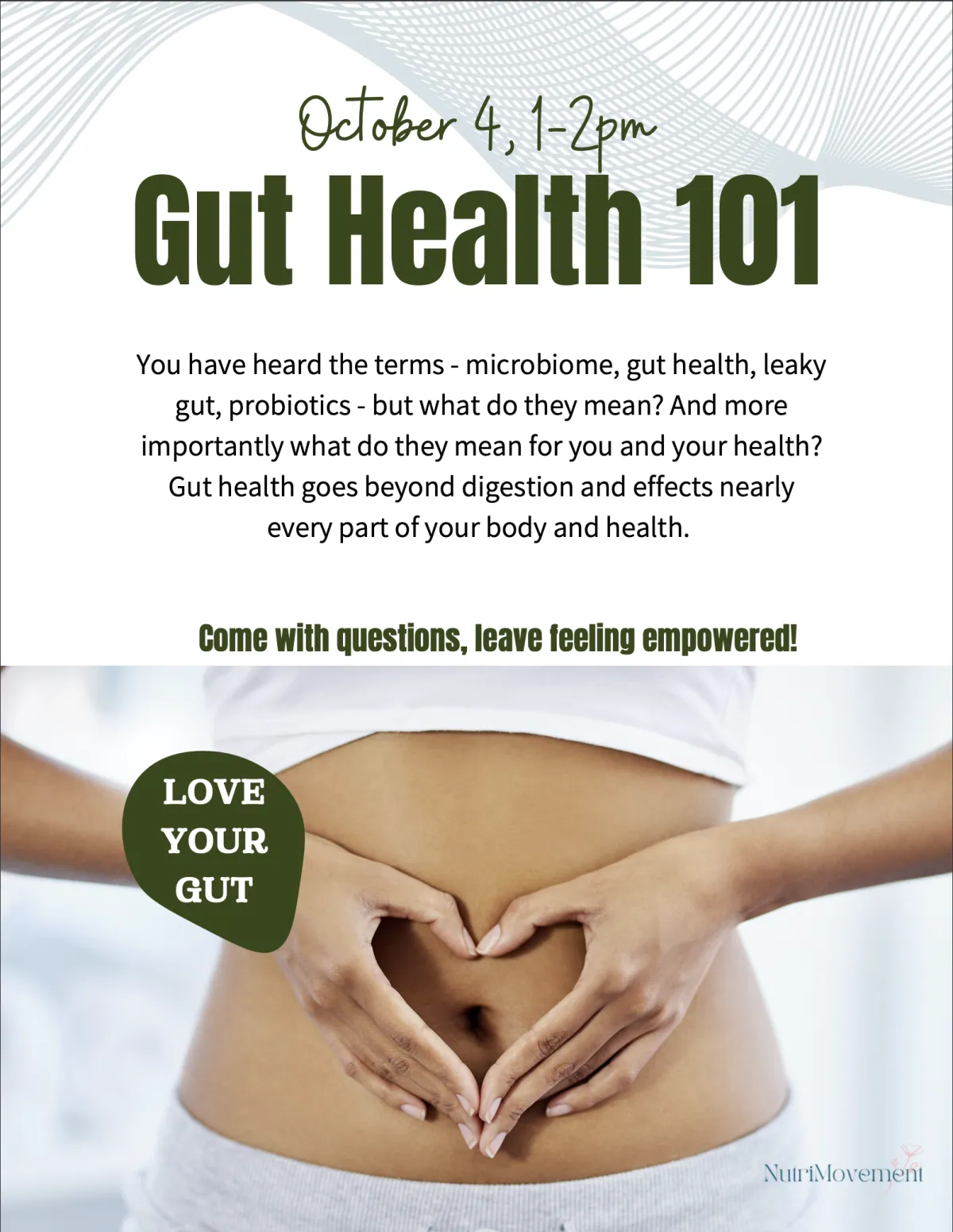 Your gut does more than digest food — it plays a vital role in immunity, energy, mood, and overall health. Join us for our Gut Health 101 Workshop, where we’ll break down the science behind the microbiome, explain how gut balance affects everything from inflammation to sleep, and share simple, actionable steps you can take to improve your well-being from the inside out.